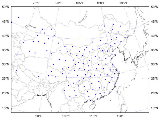 First, ground observations from automatic weather stations (AWS) were used for verification and the distribution of these ground sites is shown in Figure 1. Reliable surface temperature, humidity, and precipitation amounts (using rain gauges) with high temporal frequency can be obtained from AWS [36]. To match the forecast grid point values to the observation points in the horizontal plane, the forecast value was assigned the value at the nearest grid point for comparison.