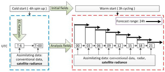 To investigate the impact of satellite radiance data assimilation in RMAPS, two retrospective runs, a control (CTRL) run without satellite radiances and an experimental run (DA_RAD) with satellite radiance observations, were conducted over a 12-day (1–12 August 2017) period. These CTRL and DA_RAD runs started at 0000 UTC on 1 August 2017, when the initial conditions from the EC forecasts were introduced into RMAPS after a 6-h spin up, as shown in Figure 4. DA_RAD used all data, including the satellite radiance data, and CTRL used all data excluding the satellite radiance data. A 3-h cycling configuration was adopted as used operationally, and a 24-h forecast was produced for each 3-h cycle, yielding a total of 96 forecasts for each retrospective run.