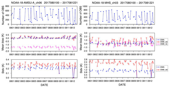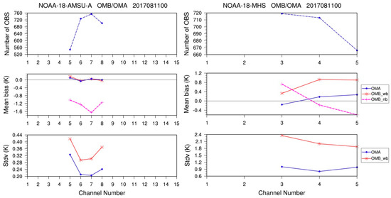 The number of observations, mean bias, and standard deviation (Stdv) of AMSU-A channel 6 and MHS channel 3 of NOAA-18 for OMB without (OMB_nb) and with (OMB_wb) bias correction and OMA, valid from 0000 UTC on 1 August 2017, to 2100 UTC on 12 August 2017. OMB: observation minus background; OMA: observation minus analysis.