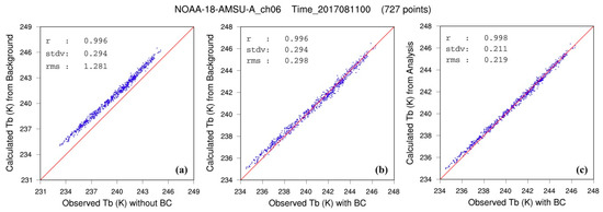Figure 6 shows the statistics of the channels for AMSU-A and MHS from NOAA-18 at 0000 UTC on 11 August 2017. The channels that are sensitive to the surface were not used for the assimilation because they usually have large errors and uncertainty. QC removes the channels that contain significant amplitudes from the surface (channels 1–4, and 15 for AMSU-A and channels 1 and 2 for MHS) and that are over the vertical limit of RMAPS (channels 10–14 for AMSU-A), 50 hPa. Also, channels that have high bias and RMSE values when compared with derived results from the first guess fields should not be considered for assimilation. Therefore, we can see that the radiance observations assimilated in RMAPS are primarily from channels 5–8 of AMSU-A and channels 3–5 of MHS. After the bias correction (BC), the mean biases of each channel were reduced for AMSU-A but were increased for channels 4 and 5 of MHS. The Stdv of OMA is noticeably reduced for both AMSU-A and MHS. Figure 7 shows the scatter plots of the calculated brightness temperatures (Tb) versus observations. It can be seen that RMSE of the background with BC decreased from 1.281 K to 0.298 K (by 76.7%) compared to the results prior to BC. Compared to the results from the background, the RMSE and Stdv of the analysis are both reduced and the correlation coefficient between the results of the analysis and the observations slightly increased from 0.996 to 0.998.