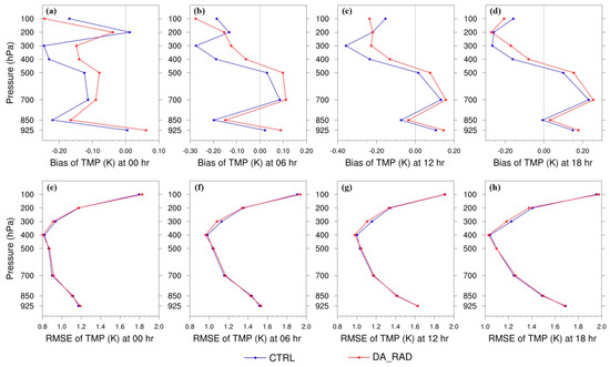 The average bias (a–d) and RMSE (e–h) of the vertical temperature (TMP) profiles at hours 00, 06, 12, and 18 for retrospective run forecasts (over the period of 1–12 August 2017) without (CTRL) and with (DA_RAD) satellite radiances.