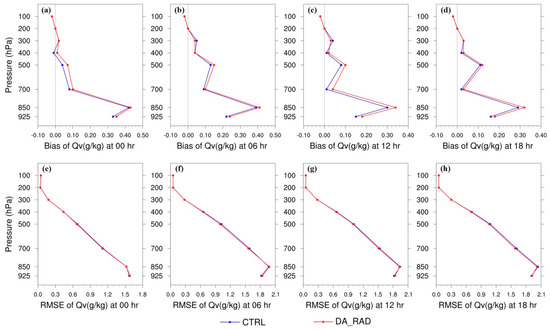 The average bias (a–d) and RMSE (e–h) of the vertical humidity (Qv: water vapor mixing ratio) profiles at hours 00, 06, 18, and 24 of the forecasts for retrospective runs (over the period of 1–12 August 2017) without (CTRL) and with (DA_RAD) satellite radiances.