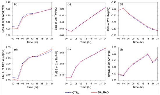 Figure 10 shows the time series of the 3-h average bias and RMSE for several forecast surface components, including the wind at 10 m and temperature (TMP) and humidity (Qv) at 2 m. Compared to CTRL, the satellite radiance data assimilation had a slight positive impact on the wind speed at 10 m for the forecast range of 0–12 h, the average bias was reduced from 1.14 to 1.12 m/s and the RMSE from 2.17 to 2.16 m/s. For the temperature at 2 m, there is almost no difference for the average bias and RMSE between the two retrospective runs, except for a small decrease in the RMSE at 00 h in DA_RAD. For the humidity at 2 m, the average bias increased after 6 h in DA_RAD and the average RMSE has a slight overall increase for the 24-h forecast range including the satellite radiances.