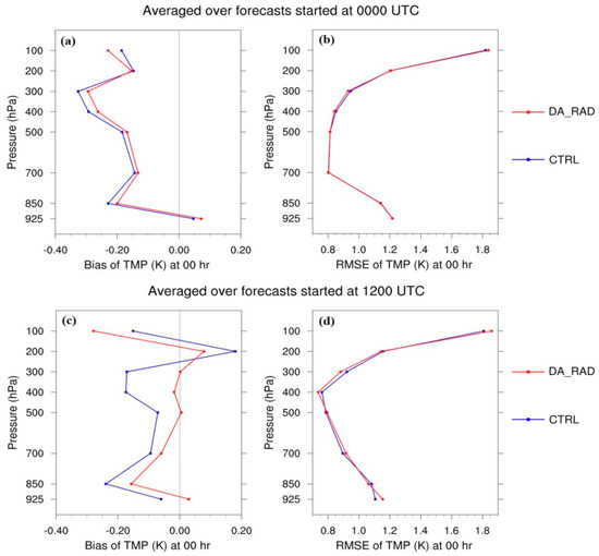 The averaged bias and RMSE of the temperature (TMP) vertical profiles at the analysis time 00 h for forecasts started at (a,b) 0000 UTC and (c,d) 1200 UTC.