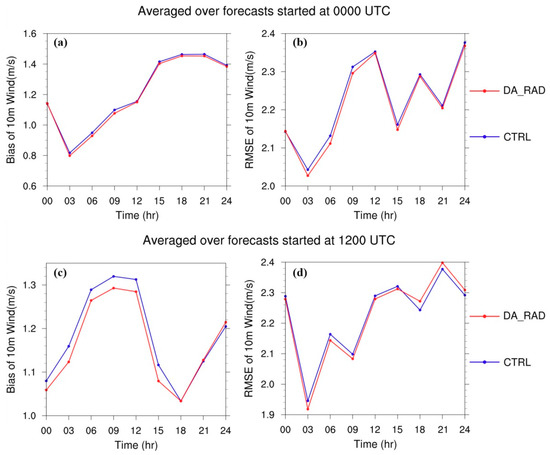 To further explore the impact of the satellite radiance observations in RMAPS, we investigated forecasts at different starting times. Because radiosonde observations were available every 12 h, we selected two groups of forecasts that started at 0000 UTC (2017080100–2017081200) and 1200 UTC (2017080112–2017081212) for further investigation. There are twelve 24-h forecasts included in CTRL and DA_RAD for each group. Figure 11 shows the average bias and RMSE of the vertical temperature profiles at the analysis time of 00 h for the forecasts in the two groups. Compared to CTRL, the average bias of the temperature between 300 hPa and 850 hPa in DA_RAD was improved in both groups; however, the improvement in the RMSE was tiny. For the forecasts started at 0000 UTC, the value in DA_RAD is reduced from 0.24 to 0.21 K (approximately 12.5%) for the bias and from 0.910 to 0.905 K (approximately 0.55%) for the RMSE compared to that of CTRL. For the forecasts started at 1200 UTC, an improvement in DA_RAD can be found below 200 hPa for the average bias of the temperature with the value reduced from 0.09 to 0.02 K (approximately 77.8%), and from 0.88 to 0.87 K (approximately 1.14%) for the average RMSE between 300 hPa and 850 hPa. Figure 12 shows the average bias and RMSE of the wind at 10 m for the two groups. Compared to CTRL, the average bias and RMSE in DA_RAD have an improvement of 1.2% and 0.5% in the first 12 h for the group of forecasts started at 0000 UTC, and 2.4% and 0.9% for the group of forecasts started at 1200 UTC. That is, satellite radiance observations from 1200 UTC contribute relatively significantly to the improvement in the initial temperature field and the wind at 10 m, even though the improvement is very small.