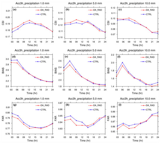 In addition, observations from ground stations and rainfall scores were used to evaluate the impact of satellite radiances on the rainfall forecasting skill in RMAPS. The rainfall scores were averaged over ninety-six 24 h forecasts during the experimental period. Figure 13 shows the average CSI, BIAS, and FAR for the 3-h accumulated precipitation in Domain 1 with thresholds of 1.0 mm, 5.0 mm, and 10.0 mm. Compared to CTRL, the average CSI score in DA_RAD has an improvement in the first 12 h of the forecast range, with 2.0%, 3.0% and 2.9% for the thresholds of 1.0 mm, 5.0 mm and 10.0 mm, respectively. There is a corresponding decrease in the average BIAS score, especially for the first 6 h. The value is reduced from 2.96 to 2.70 for 1.0 mm, from 2.50 to 2.39 for 5.0 mm and from 1.89 to 1.79 for 10.0 mm in the first 6 h. However, the BIAS scores are still above 1.0 for both CTRL and DA_RAD, which is indicative of an over prediction for all thresholds. This indicates that the satellite radiance data assimilation provides a small improvement for over-prediction, leading to an improvement in the rainfall forecast skill below 10.0 mm for the first 12 h in RMAPS. Consistently, the FAR indices of DA_RAD also decreased in the first 12 h of the forecast range compared to the values of CTRL, but the improvements are all below 1%. This suggests that the false-prediction fraction was a little smaller for DA_RAD than for CTRL below 10.0 mm for the 3-h accumulated precipitation.