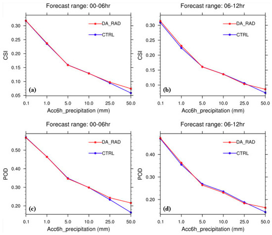 Figure 14 further displays the average CSI and POD indices of the 6-h accumulated precipitation in Domain 2 for different thresholds for the first 12 h of the forecasts. It can be seen that the CSI and POD indices have a similar tendency. They both rapidly decrease with increasing threshold. Below the threshold of 25.0 mm, the rainfall skills of the forecasts with and without satellite radiances are roughly equivalent for CTRL and DA_RAD with similar CSI scores. For the threshold above 50 mm, the average CSI score in DA_RAD increased to 0.080 from 0.066 (approximately 20.7%) over the forecast range of 0–12 h, even though the value is still small (below 0.1). There is a corresponding increase for the POD, from 0.15 to 0.19 (approximately 22.8%). From the skill scores of the 6-h accumulated precipitation, we can see that the satellite radiance data assimilation in RMAPS has a slight positive impact on the heavy rainfall forecast over North China, which is covered by Domain 2.