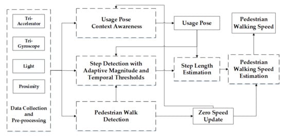 Due to the development of microelectronics technology, modern smartphones are equipped with a rich set of sensors and have been explored as a ubiquitous computing platform. With this platform, particular attention has been focused on the estimation of the walking speed of pedestrians, which, as a “body speedometer,” can reveal pedestrians health status information, such as joint strength [1] and lifestyle [2], and predict future health [3]. A precise walking speed is necessary for the use of many location-based services as well, especially in the indoor environment where most global navigation satellite system (GNSS) signals are blocked.