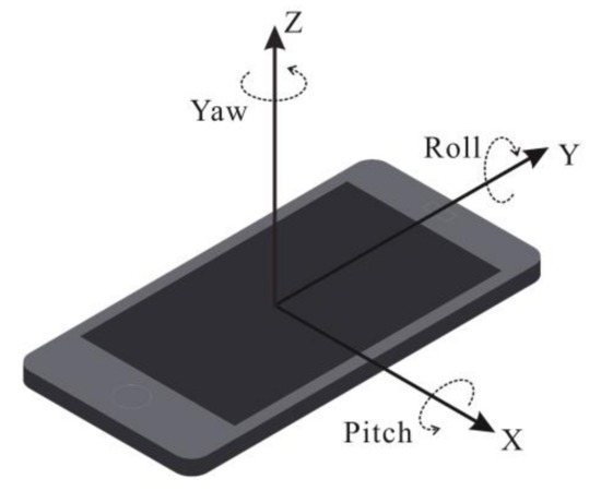 As shown in Figure 3, the coordinate system of the sensors in a smartphone is defined with the screen of the phone and its default orientation. Pitch and roll are the rotation around the x-axis and the rotation around the z-axis, respectively.