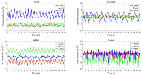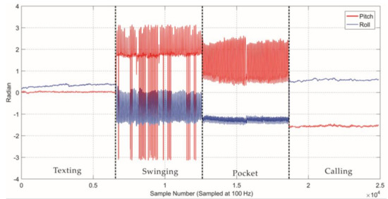 When the pose mode changes, for example, texting mode transit into swinging mode, the pitch and roll change synchronously and sensitively and demonstrate different patterns. As shown in Figure 4, in a relatively steady state (hand texting, hand calling, in the pocket), the mobile device remains relatively static with the body. Therefore, the pitch and roll angles are relatively significant in those processes, whereas in a relatively dynamic state (hand swinging), pitch and roll angle change only periodically.