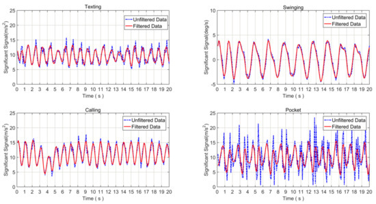 To minimize the impact of the mobile device shaking and sensor drift, and to improve the robustness of the step detection algorithm, a 10th order Butterworth filter [44] with a 3-Hz cut-off frequency was used for preprocessing of the time-series sensors feature signal. The purpose of the above pre-processing phase was to extract the signal’s fundamental frequency that is induced by step events only and therefore only from an undistorted signal [45]. In this manner, the interference from high-frequency noise and unstable output sensors data can be reduced. In Figure 6, the raw data and the output after filtering are compared.
