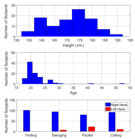 Two experiments were carried out in the indoor environment to test the proposed algorithms. In the first experiment, the performance of the usage pose context awareness algorithm was evaluated based on field tests carried out in the lobby of the Library of Wuhan University. Sixty-three male subjects and thirty-eight female subjects took part in this experiment. As shown in Figure 7, the subject heights varied from 155–192 cm, and their ages ranged from 17 to 53. Because of the subjects’ different patterns in smartphone use, we subdivided the calling, swinging, and pocket modes into left-hand use and right-hand use. The percentages of swinging, pocket, and calling modes with the use of the left hand were 6.93%, 21.78%, and 9.9%, and the percentages of the three modes with the use of the right hand were 93.07%, 78.22%, and 90.1%, respectively. In the training process, sixty percent of the subjects’ recorded multi-sensors data that were used to train the classifier, and in the testing part, the other forty percent of the subjects’ data were used to test the performance of the classifier. Four smartphones, including Huawei Mate9, Huawei P9, Huawei P9 Plus, and Huawei Honor 8, were used in the experiment, and all with Android platforms. The sensor data, including the accelerometer, gyroscope, light sensor, and proximity sensor data, were collected and labeled by an android application in real time, and the sampling rate of the sensors was set to 100 Hz.