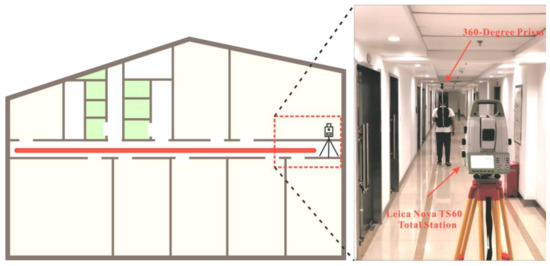 Experimental site. A Leica Nova TS60 total station was placed at the end of the corridor and automatically tracked a 360-degree prism. Participants carried the 360-degree prism on their back and held the smartphone in their hand.