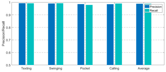 Figure 9 provides the precision and recall rate of the proposed pose context awareness. The average precision rate of the proposed algorithm was 98.833% and the average recall rate was 98.828%. Table 3 shows a confusion matrix of the classification results. For the proposed algorithm, an overall accuracy (OA) of 98.85% and a kappa statistic (KS) of 98.46% were obtained. User’s accuracy (UA) and producer’s accuracy (PA) were above 97.88% in all the classes, and the commission error (CE) and omission error (OE) were within 2.12% in all the classes.