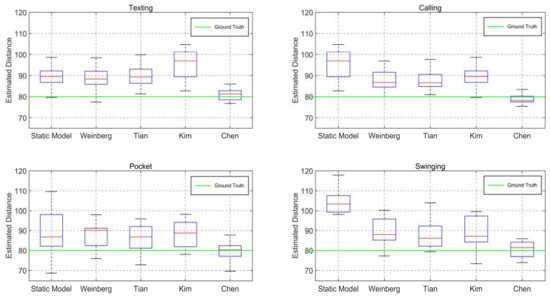 In this test, participants carried the 360-degree prism and walked 80 m with four different poses. a comparison of the performance using five step length estimation models was carried out, and we analyzed their precision in texting, pocket, swinging, and calling modes. Figure 10 illustrates the maximum and minimum values, lower and upper quartiles, and median walking length obtained using the five step length models, including the static [46], Weinberg [28], Tian [47], Kim [29], and Chen [22] models, in four posture modes. In Figure 10, the red line represents the median of estimation distance and the green line represents the actual distance (80 m). The performance of the Chen method showed the highest precision and greatest robustness by significant margins. For texting mode, the length-estimating errors of the Chen method were within (76.75 m, 85.95 m) and the 25% and 75% errors were 78.46 m and 82.83 m. For calling mode, the length-estimating errors were within (75.36 m, 87.37 m) and the 25% and 75% errors were 77.50 m and 82.40 m. For pocket mode, the length-estimating errors were within (69.62 m, 87.82 m), and the 25% and 75% error were 77.05 m and 82.39 m, respectively. For swinging mode, the length-estimating errors were within (73.92 m, 109.51 m), and the 25% and 75% error were 76.97 m and 84.15 m, respectively.