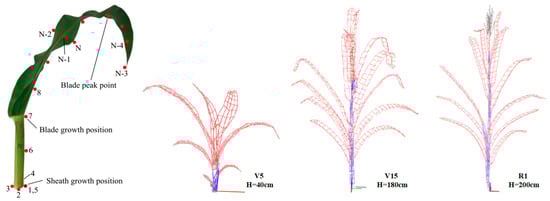 3D digitizer, an electromagnetic device that could measure the location and orientation of target objects, is a popular approach to characterize the feature points in 3D space, and especially fits for branch structured plants [31,36]. In this study, Fastrak 3D digitizer (Polhemus, Colchester, VT, USA) combined with Tx4 emitter was used to obtain the 3D featured points of the selected plants. Each 3D coordinate of the featured point was acquired by a free-moving pen operated manually. 3D digitizing principle was formulated for the basic phytomer unit, as shown in Figure 3. A phytomer is composed of a node, an internode, a sheath, and a blade. The 3D digitizing of a phytomer started from the node, i.e., the growth point of the sheath. The first point was the bottom of the sheath. Further, three points were recorded clockwise around the sheath at the quarter position points, and the fifth point overlapped with the first point. The following sixth and seventh points were recorded at middle and top of the sheath, respectively. Then the blade vein was digitalized with appropriate distance, generally about 5 cm step length. The step length was appropriately reduced at bending positions to promise the curving shape of the vein described accurately. Finally, three points were recorded along the widest section of leaf perpendicular to the vein direction. The phytomer acquisition procedure of the individual plant was conducted from lower to upper leaves, and lower sheath and blade of a phytomer were peeled off to release the sheath and blade of the next phytomer. Tassel and ears were also digitized as independent organs parallel to the phytomers. It took about 5, 15, and 20 min of an individual plant at V5, V15, and R1 stages, respectively. The emitter and plant should remain relatively static during the data acquisition process. Metal objects were forbidden to appear around the emitter because metal would affect the magnetic field of the digitizer. 3D digitizing visualization, processing, and phenotyping traits estimation were conducted by using our previously developed software MaizeTypeAns [30] for maize plants. Figure 3 shows the 3D digitizing visualization result of maize plants in three growth stages.