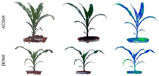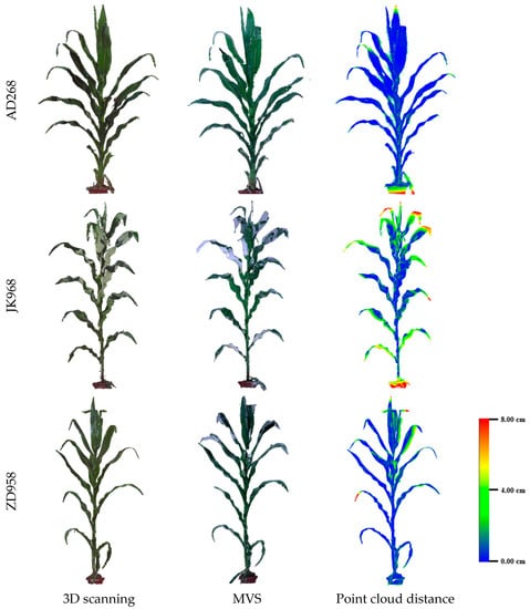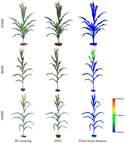 Point clouds were obtained in both 3D scanning and MVS reconstruction. Thus the accuracy of these two approaches was evaluated by comparing the acquired point clouds of the three hybrids plants in three growth stages. Figure 4, Figure 5 and Figure 6 illustrate the visualization of the point clouds derived by 3D scanning and MVS reconstruction. Clearly, MVS reconstruction shows better result than 3D scanning of small plants (V5 stage), as the thinner leaves are rather unstable and may wave during the entire data acquisition process (nine plants were scanned together for totally about 30 min in 3D scanning process while only one plant took 1.5 min in MVS image acquisition). In contrast, significant differences between the two approaches were not observed for medium and higher plants (V15 and R1 stages). Point cloud distances were estimated by “cloud→cloud dist” tool in CloudCompare (2.10.beta, http://www.cloudcompare.org/), which is an open source project of 3D point cloud and mesh processing. More deviations were observed in upper parts of JK968 and ZD958 at V15 and R1 stages. This is attributed to the fact that the plants of these two hybrids in the later growth stages were too tall and the image acquisition for MVS reconstruction was performed twice, including three layers. Therefore, when accuracy is the major indicator to be considered, it is advised that MVS reconstruction is more suitable for early growth stage maize plants and 3D scanning obtains better results for later growth stage maize plants.