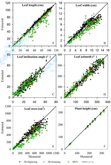 Phenotyping parameter evaluation derived by 3D scanning, MVS reconstruction, 3D digitizing, and manual measurement. The samples used contain all three hybrid plants in three growth stages. Evaluated parameters include (A) leaf length, (B) leaf width, (C) leaf inclination angle, (D) leaf azimuth, (E) leaf area, and (F) plant height.
