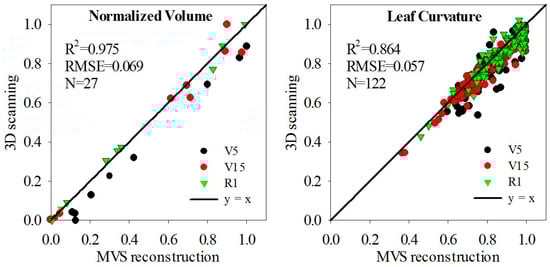 Moreover, the normalized volume of the plants and leaf curvature directly estimated by the 3D scanning and MVS reconstructed point clouds were compared to evaluate the phenotypic differences caused by the two approaches (Figure 8). The normalized volume was estimated as follows: