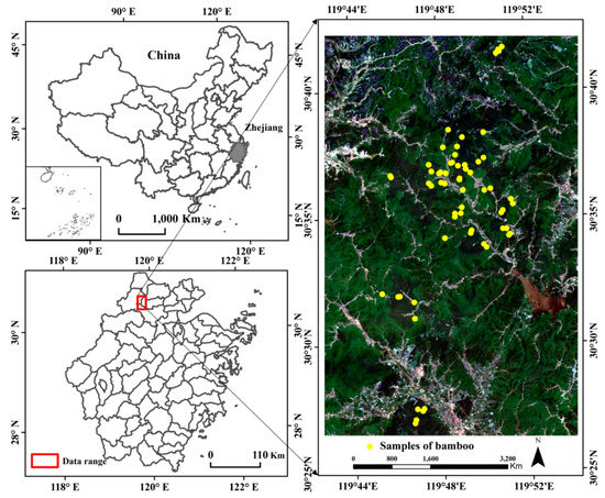 This study area is in subtropical evergreen forests, including coniferous evergreen, broadleaf evergreen, and bamboo. There are also other plantations such as pines, Chinese fir, and agroforestry. Moso bamboo forest (Phyllostachys pubescens) is the most widely distributed bamboo forest type in this study area, accounting for 86% of the total bamboo forests [31]. Moso bamboo trees are taller and have larger diameter at breast height (DBH) than any other bamboo forests such as Phyllostachy snuda [32]. The average height of Moso bamboo is between 9 and 12 m and the average DBH is between 8 and 11 cm. In addition, Moso bamboo forests have single species and stand structure, but stand densities may vary greatly in sites and different seasons because of their on-year and off-year growth characteristics and intensive management, such as selective logging of trees 3 du or older in the on-year bamboo forests during winter [33].