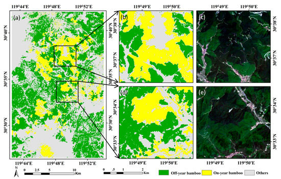 where S5 and S4 represent Sentinel-2 data in May and April. The on-year and off-year bamboo forests in April and May have obvious forest stand structure change, resulting in high variation of SBI compared to other forest types. Therefore, the thresholds of SBI were used to separate on-year and off-year bamboo forests; that is, when SBI > 1.35, the pixels were grouped as off-year bamboo forest, and when SBI < 1.1, the pixels were grouped as on-year bamboo forest. The final results were classified as three classes: On-year bamboo, off-year bamboo, and others, as illustrated in Figure 6. In 2018, the on-year bamboo forests were mainly distributed in the central part of this study area, while off-year bamboo forests were in the southeast, west, and north. The accuracy assessment result (Table 5) indicates that on-year and off-year bamboo forests can be accurately extracted from the bi-seasonal images with producer’s accuracy of 90% to 93% and user’s accuracy of 91% to 93%.