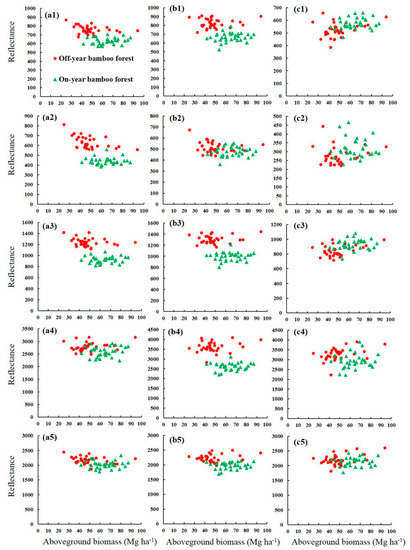 Figure 7 also indicates that with the combination of on-year and off-year bamboo forest as one population, the linear relationships between AGB and spectral bands in green, red, and RedEdge1 in April, green, RedEdge1, and NIR1 in May, and green and RedEdge1 in July have obviously linear relationships until AGB reaches about 60 Mgha−1. The better linear relationships and higher AGB saturation values in the combination of on-year and off-year bamboo forest than in on-year or off-year alone imply that stratification of on-year and off-year bamboo forests may not be necessary.
