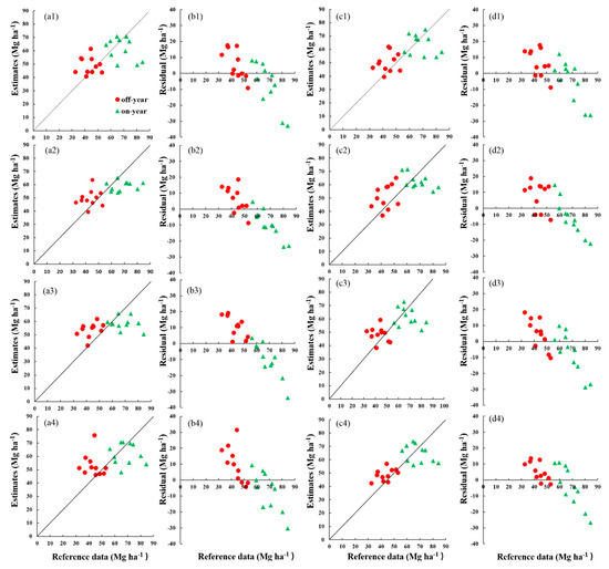 With non-stratification, (a1–a4) represent the relationships between biomass estimates and sample plots based on combined April and July images (a1), individual April (a2), May (a3), and July (a4), respectively, and (b1–b4) are corresponding residuals; with stratification, (c1–c4) represent the relationships between biomass estimates and sample plots based on combined two seasonal images (c1), individual April (c2), May (c3) and July (c4), respectively, and (d1–d4) are corresponding residuals.