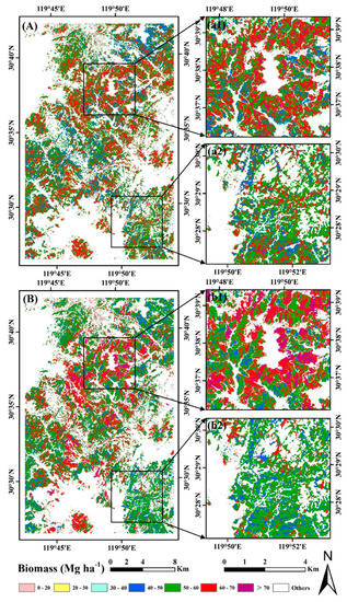 Biomass estimation results with non-stratification using the April image (A) with highlighted sites (a1) and (a2); and stratification of on-year and off-year bamboo forests using the July image (B) with highlighted sites (b1) and (b2).