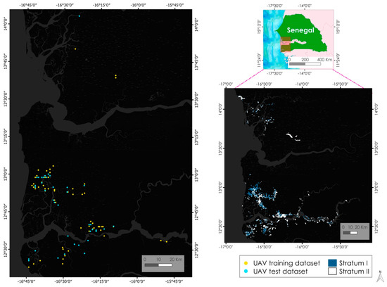 A total of seven Sentinel-2 images were initially used as auxiliary information to generate a wall-to-wall stratification of the mangrove plantations in the study area, which aids to encompass the full range of available AGB. Two main strata were defined to allocate efficiently a stratified systematic sample of UAV-based plots in each of them, (i) one with very low AGB densities due to high plantation mortality and low plantation development stage (Stratum I) and (ii) the second stratum with higher AGB densities and therefore, lower mortality rates and higher tree cover and plantation development stage (Stratum II).