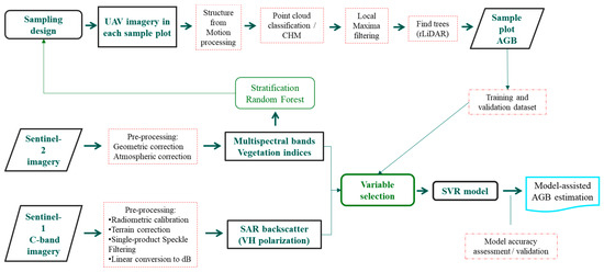 General methodology workflow used for AGB estimation integrating the Sentinel SAR and multispectral data. UAV-derived imagery was used for sampling plot measuring.