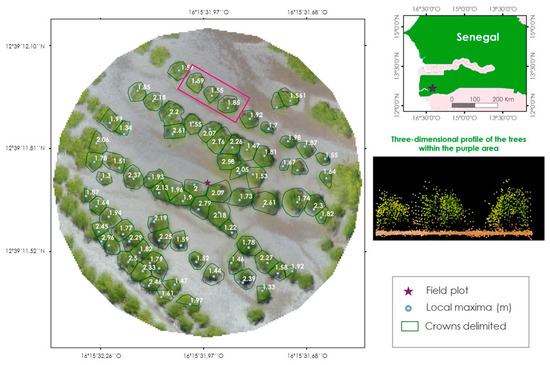 Example of individual tree detection from UAV-derived CHM, local maxima (m), and crown delineation for a sample plot.