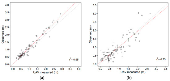 Scatter plot detailing the coefficient of determination (r2) between (a) field measured height (m) and the maximum height from UAV-derived point clouds for individual trees and (b) field measured tree crown diameters (m) and tree crown diameters from UAV-derived point clouds. The red line shows the linear fit of the UAV-derived point clouds measurements and field observed values. The grey line in the center indicates 1:1.