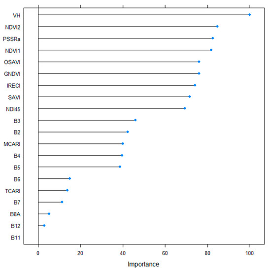 Two RF models were fitted, one for the classification of 9th March 2017 (western zone of the study area) images and one for classifying 24 February 2017 images (eastern zone). A total of 20 variables were used as predictors in the image classification procedure: 10 Sentinel-2 spectral bands and 10 Sentinel-2 vegetation indices (Table 2). A random forest variable selection algorithm VSURF [77] was applied to reduce the number of predictor variables and to improve the performance of the Random Forest models (Table 3).