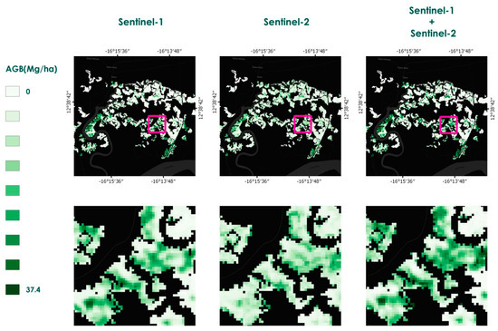The mean model-assisted AGB estimates in the stratum I ranged from 0.75 to 0.99 Mg ha−1 (SE = 0.30–0.35 Mg ha−1) while for the UAV-based the mean AGB estimate was 0.33 Mg ha−1 (SE = 0.35 Mg ha−1). The highest RE was obtained using Sentinel-2-assisted estimates (RE = 1.32). For Stratum II, the estimated mean AGB values ranged between 6.04 and 9.12 (SE = 0.88–1.16 Mg ha−1). The best results in terms of RE were achieved using the combination of spectral indices from Sentinel-2 and the backscatter from Sentinel-1 (RE = 2.87). Figure 7 shows the estimated AGB maps generated using the three adjusted SVR models. All maps showed similar patterns of AGB density distribution, but the model based on Sentinel-2 data variables led to lower AGB estimated values than the models including Sentinel-1 VH polarization.