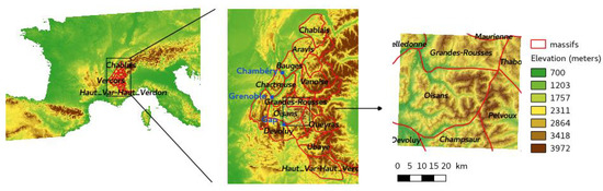 Topography of the study area located in Europe, France, Northern French Alps. The mountainous regions concerned are the Oisans, Grandes-Rousses, Pelvoux, Champsaur, Thabor, Devoluy, Belledonne and Maurienne.