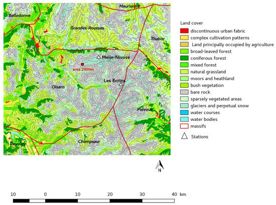 CORINE Land Cover products at 25 m resolution over our study area with the massifs delimitations, stations and the area of 2900 m used in Section 3.