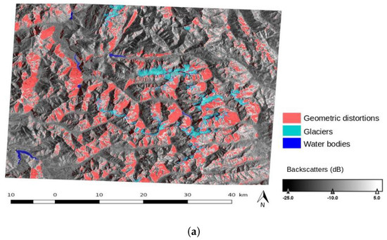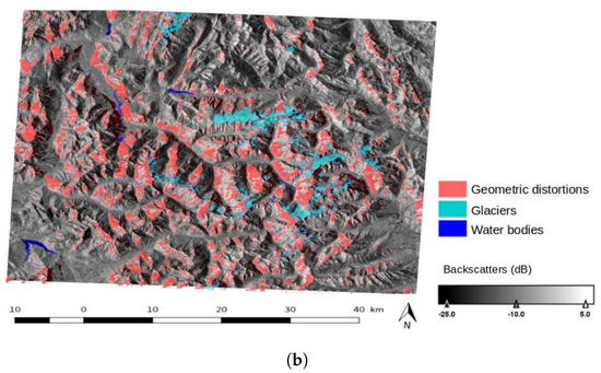 The selected Sentinel-1 images from ascending and descending orbits are shown in Table 1. Areas of excessive geometric distortions were identified for each orbit using the Sentinel Application Platform (SNAP) modules and used to screen out pixels associated with geometric distortions. Figure 3 shows SAR backscatter values at VV polarization (in dB) obtained on 13 February 2017 (descending orbit) and on 14 February 2017 (ascending orbit) together with the corresponding geometric distortions mask (displayed in red). For clarity, lakes (in dark blue) and glaciers (in light blue) are also displayed. One could notice that a significant number of pixels was screened out due to geometric distortions, around 14% and 16% of total pixels for ascending and descending images, respectively. Combination of ascending and descending orbits to optimally observe mountains is necessary to overcome the inherent SAR geometric distortions.