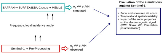 The exploitation of C-band SAR signals over snow can proceed further than mapping of wet snow. Inferring other snow properties, such as snow depth, mass or internal properties, can either be performed through geophysical retrievals [14,15,16,17,18] or data assimilation using snowpack models [4,19]. In both cases, this requires a quantitative understanding of the relationships between snow properties and SAR signal. Along with other satellite observations [20,21], there is hope that data assimilation in detailed snowpack models can improve our snow monitoring and prediction capabilities, especially at high elevation where in-situ observations are particularly scarce [3]. Several surface and volume scattering models have been developed since the 1980s [22] addressing either the passive or active microwave behavior of snow. Recently, the Microwave Emission Model for Layered Snowpacks (MEMLS) [23], initially devoted to passive microwave signals, was extended to computing radar backscatter (MEMLS3&a) [24]. The passive microwave implementation of MEMLS has previously been driven by snowpack model output [25,26]) or in-situ snow measurements [27]. Recent studies have driven MEMLS3&a with in-situ snow measurements to feed the model and to compare with SAR measurements [28,29]. However, most previous studies were carried out at the point scale, using in-situ snow observations or using in-situ meteorological observations to drive snowpack models, and comparing to in-situ SAR observations rather than from satellite-borne sensors. While they demonstrated potential in using such data for larger scale use operationally, few studies have attempted to simulate explicitly radar backscatter at the regional scale, although this is a prerequisite for data assimilation in snowpack models.