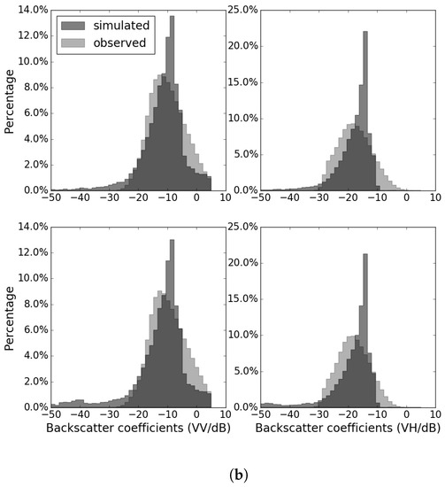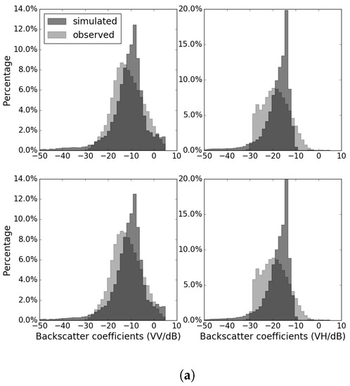 Figure 5 provides results from four different snow free dates (13 July 2016 and 18 August 2016 for ascending orbit and 18 July 2015 and 16 September 2015 for descending orbit). The figure shows the distributions of simulated (in dark grey) and observed backscatter values (light grey) for the four selected dates. The distributions of simulated backscatter values show smaller variability than those of the observations. For both orbit types, the simulated backscatter values are ranging from −50 dB to 5 dB for VV polarization and from −50 dB to −10 dB for VH polarization. The observed backscatter values are ranging from −30 dB to 5 dB for VV polarization and from −30 dB to 0 dB for VH polarization. For the ascending orbit, the central values of the simulated and observed distributions are separated by 6 dB for VV and VH polarization. For the descending orbit, Figure 5b shows a deviation of 5 dB between the central values for observations and simulations for both polarizations.