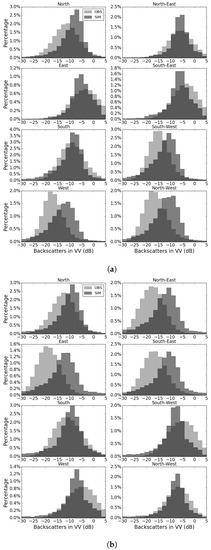 Distributions of backscatter values simulated and observed in VV polarization for the main slope aspects for two close dates (one for each orbit type): (a) 13 February 2017 (descending orbit); and (b) 14 February 2017 (ascending orbit).