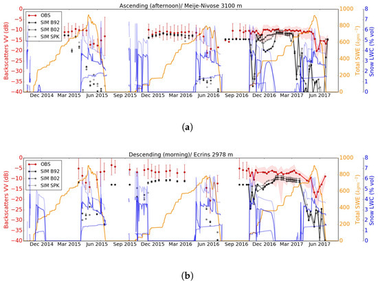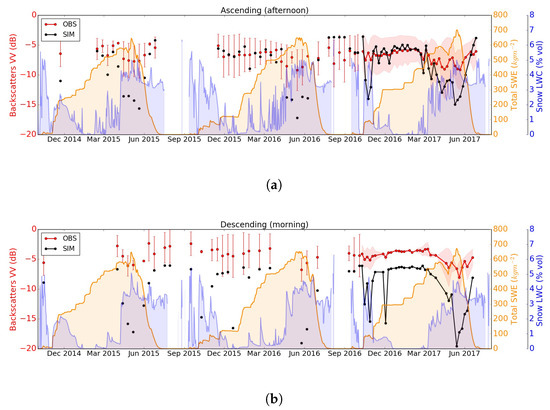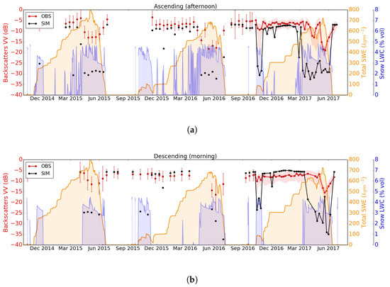 Figure 8 compares time series of observations and simulations (at VV polarization) on the 2900 m area using ascending (top) and descending orbits (bottom). Information about SWE (dashed area in orange) and LWC (blue line) are also plotted in the same panels. The simulations follow the temporal behavior more than the observations throughout the study period and there are episodes with strong deviation between observations and simulations. During snow free and dry snow periods, the figure shows a deviation of less than 2 dB for most of the dates and for both ascending and descending orbits. The changes of the simulated backscatter values following changes in snowpack conditions follow that of observations but with a larger amplitude of change. Indeed, the figure displays a negative deviation ranging from 5 dB to 25 dB. For the ascending orbit, there is a large decrease of simulated backscatter on 9 March 2015 due to an increase of simulated LWC, which does not show a corresponding decrease in observed backscatter values. For melting season periods (such as from 21 March 2015 to 13 June 2015), we observe a decrease in backscatter in both observations and simulations, along with increasing SWE. Some isolated episodes of snow melting are well represented with a decrease of backscatter for observations and simulations (see for instance October 2016 in both orbit types).