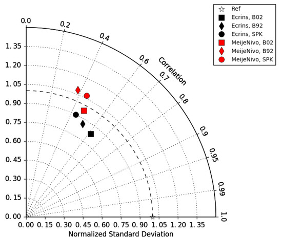 Figure 11 illustrates the Taylor diagram for each percolation parameterization and for both in-situ stations.The Ecrins station is represented in black and the Meije-Nivose station in red and the three different schemes of the percolation of liquid water in the snowpack by different markers: square, diamond and circle for B02, B92 and SPK, respectively. For the Ecrins station (descending orbit), the correlations range from 0.41 to 0.61 and the normalized standard deviation (NSTD) from 0.83 to 0.90 and for the Meije-Nivose station (ascending orbit) correlations range from 0.39 to 0.46 and the NSTD from 0.97 to 1.07. For the Ecrins station, the B02 scheme gives the best results (0.61/0.83). These results are not surprising and highlight the link between the liquid water content of the snowpack model and the simulated backscatter values. Note that the three parameterizations rely on the same “bucket” concept and are not sufficient to represent the real uncertainty of liquid water percolation modeling which involves more complex processes (e.g., capillary barriers and three-dimensional runoff [47,49]).