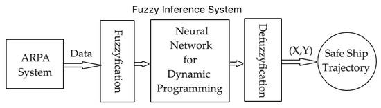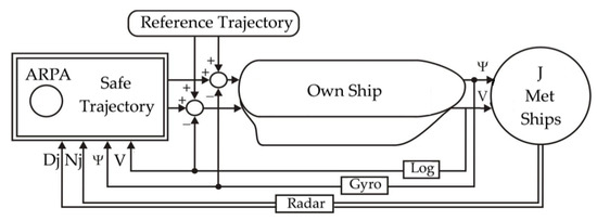 One of the most important transport issues is the safe control of movement, measured by the probability of collision risk when passing ships on the route, using information from the radar anticollision system [1,2]. In practice, there are many safe trajectories for the ship, from which an optimal trajectory can be chosen that ensures minimum collision risk and the smallest path loss on passing encountered ships [3,4,5]. The development of modern information technologies creates appropriate opportunities for the automation of navigation and construction of decision support systems to safety control the movement of a ship (Figure 1).