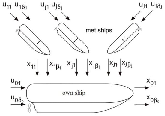 where is the β0 dimensional vector of the process state of the own-ship determined in a time span ; is the βj dimensional vector of the process state for the j-th met ship; is the δ0 dimensional control vector of the own-ship; is the δj dimensional control vector of j-th met ship [22].