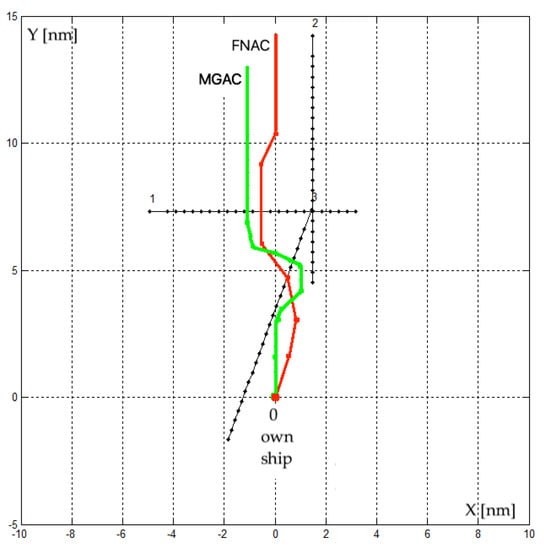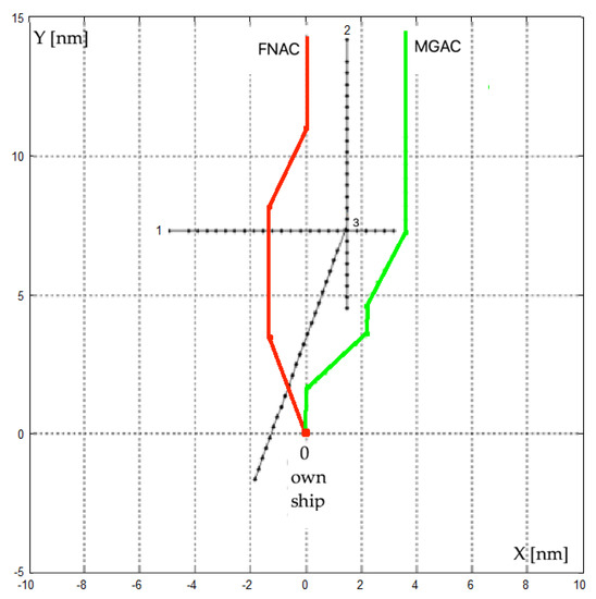 Comparison of safe and optimal trajectories of own-ship in the situation of passing three ships, in conditions of good visibility at sea at Ds = 0.2 nm, determined using the following algorithms: FNAC decision chosen trajectory = 0.5766; MGAC final payment = 1.08 nm.