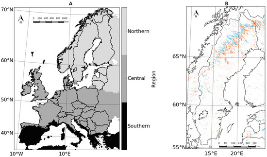 Regions of Europe (A) and Swedish example (B) of Forest Protected Areas (blue) and managed forests (red).