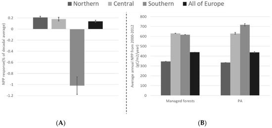 NPP response by region and for all of Europe combined (A) and mean annual NPP separated by managed forests and protected areas PA (B). Error bars indicate the standard error. Mean absolute NPP anomaly was measured relative to the decadal average for managed and conserved forest in Northern, Central, and Southern Europe as well as all of Europe. All findings were found to be statistically significant with a 95% confidence interval with P-value <0.001.