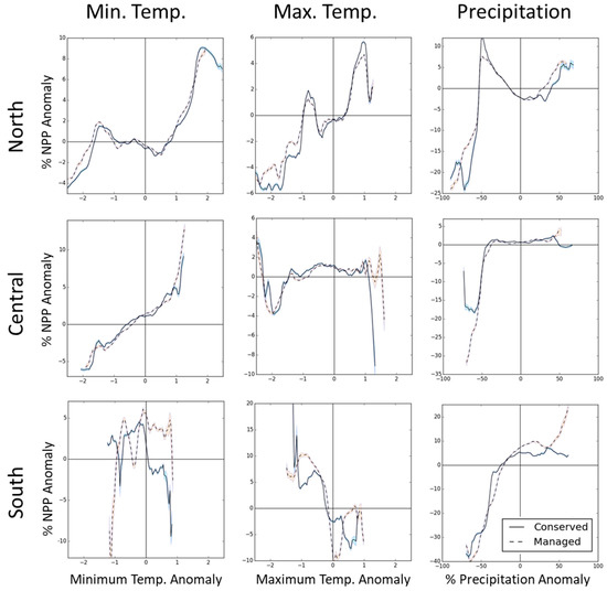 We detected significant variation in PA impact on NPP response to climate variation between regions across Europe. We found that, on average, PA forests experienced about a 3% larger responses relative to managed forests for all climate anomalies in the Northern and Central Regions. In these regions, this finding suggests greater or equal robustness to climate anomalies among managed forests as compared to PA forests. In contrast, Southern European PA forests, within the same climate anomaly interval, experienced about 6.5% less response than managed forests. Further, overall NPP was found to be the greatest in the Southern PA forest group out of all forests in this study (Figure 2 and Table A1). Additionally, climate variables impact each region in different ways (Figure 3). Increasing maximum temperature anomalies has a positive impact on NPP in the North, little impact in Central Europe, and a negative impact in the South. Precipitation, however, appears to have a similar impact across regions defined by a step response curve.