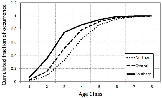 The age of a forest also affects forest NPP and robustness; reflecting the management history of a region. For this reason, we quantified the cumulative distribution function of forest age in our three regions (Figure 4) [37]. Forest age tends to increase from South to North. For example, the share of Southern European forests that are younger than 60 years old are 78%, while this share is only 48% in Central Europe and 31% in Northern Europe.