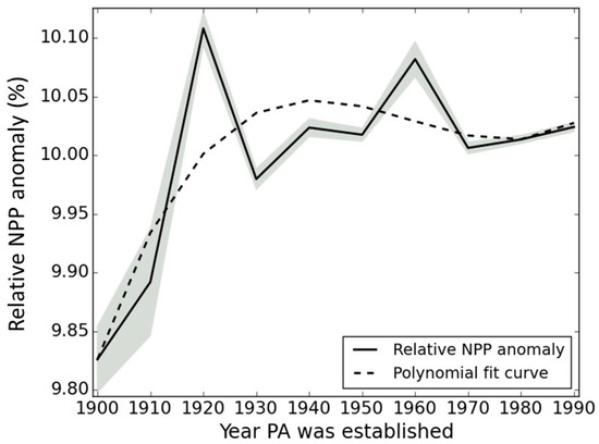 Average relative NPP response to climate variation as % to long-term mean by year forest was designate as protected. Shaded areas represent the 95% confidence interval.
